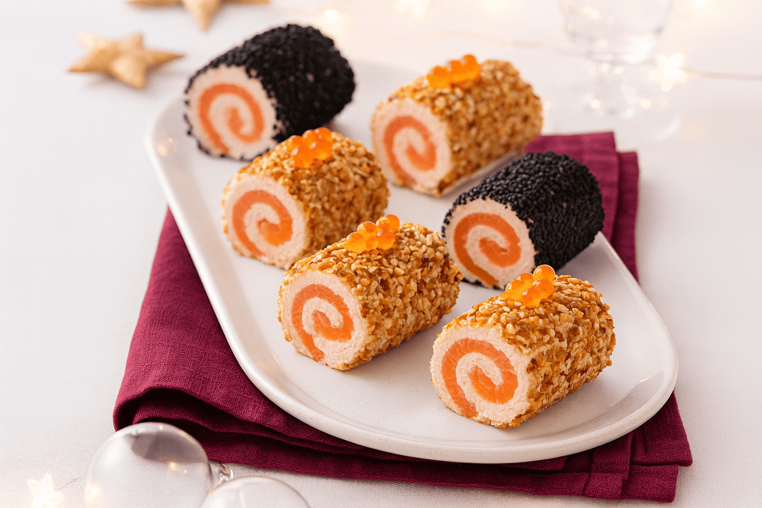 Inspirées des petits roulés festifs, ces bouchées se présentent comme de véritables mini-bûches apéritives.